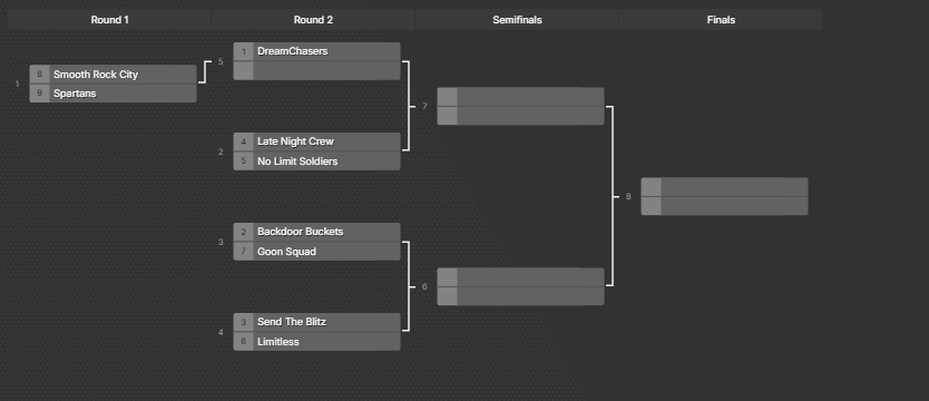 Read MoreOfficial Playoff Teams DreamChasers β 8-2 (.800) Backdoor Buckets β 11-3 (.786) Send The Blitz β 9-3 (.750) Late Night Crew β 10-6 (.625) No Limit Soldiers β 12-9 (.571) Limitless β 9-7 (.563) Goon Squad β 9-10 (.474) ...